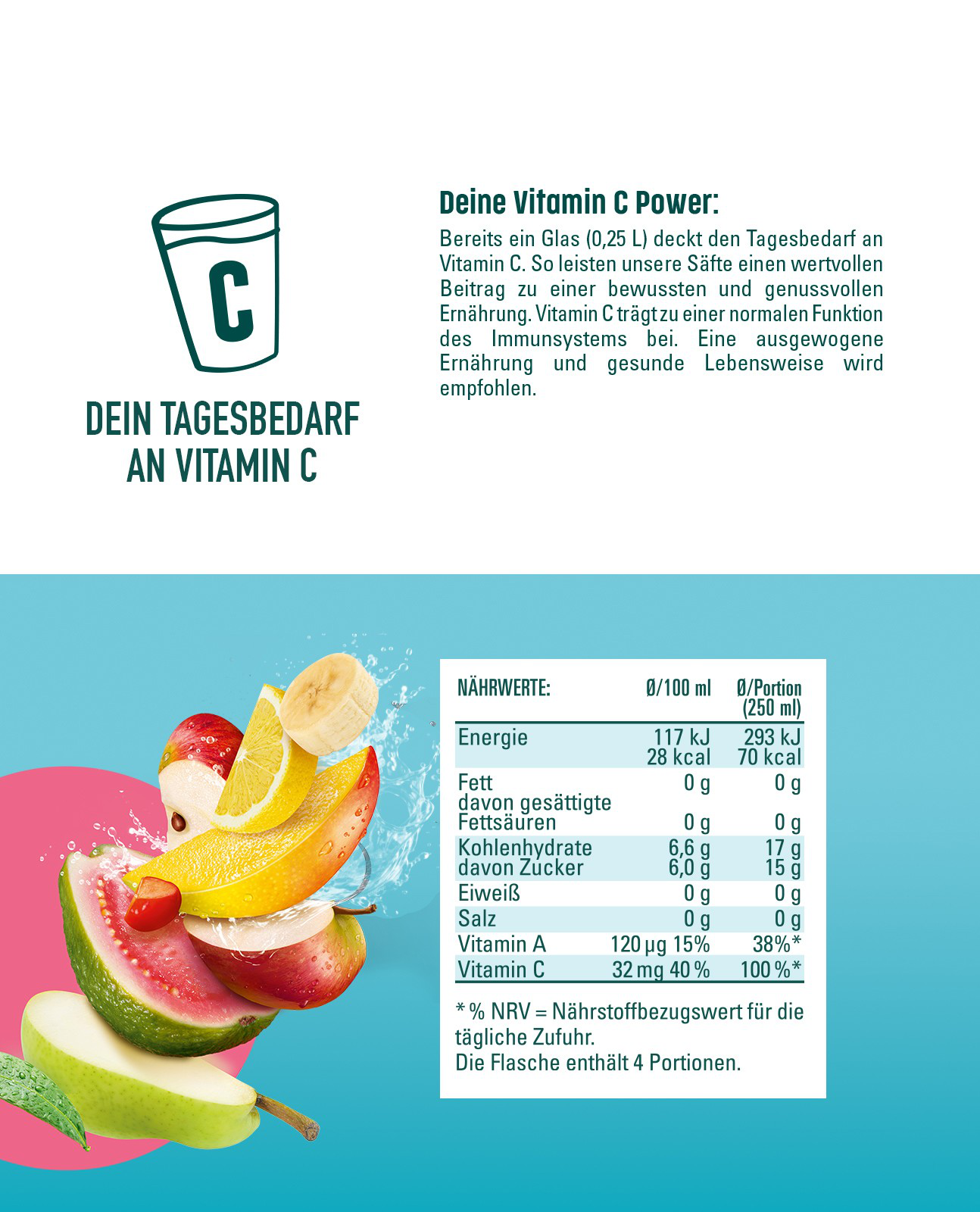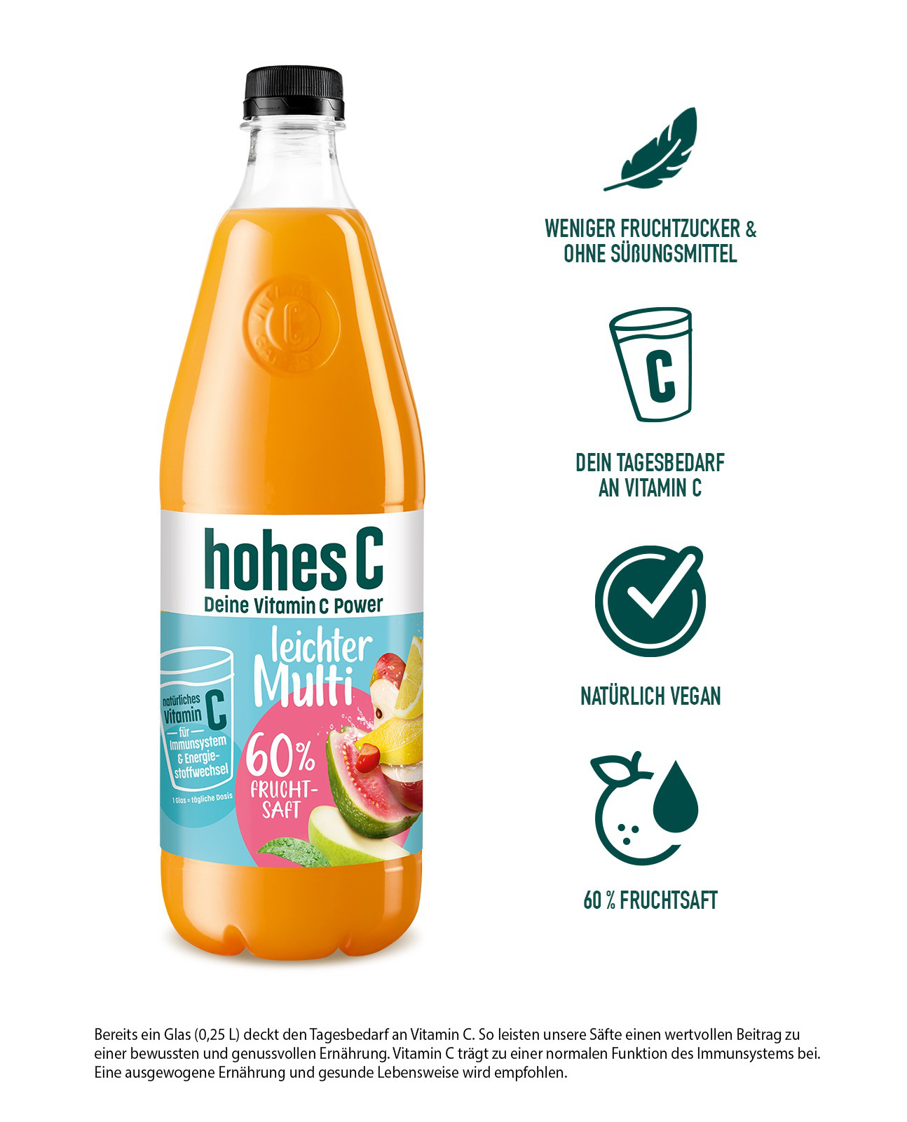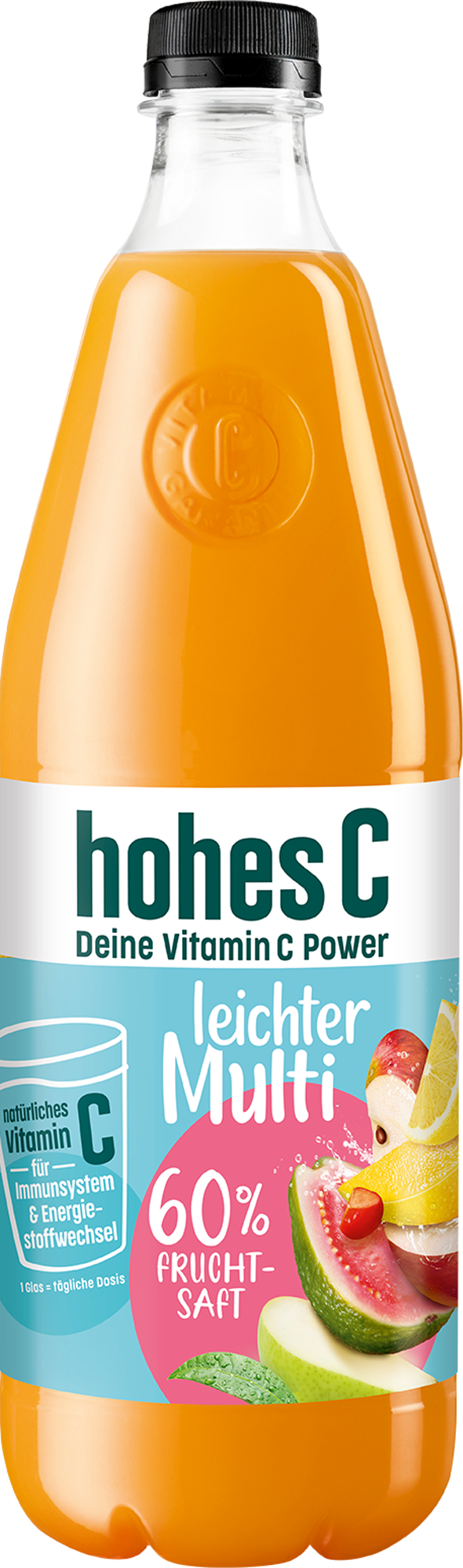 Dein Glas für den Tag: Mit unserem hohes C leichter Multi erhältst du 60% Fruchtsaft in bester hohes C Qualität - also nicht nur leicht sondern auch lecker. Schon gewusst? Bereits ein Glas hohes C leichter Multi (0,25 L) deckt den Tagesbedarf an Vitamin C - und zwar mit natürlichem Vitamin C aus der Acerola. Vitamin C trägt zu einer normalen Funktion des Immunsystems und zu einem normalen Energiestoffwechsel bei. Eine ausgewogene Ernährung und gesunde Lebensweise werden empfohlen.