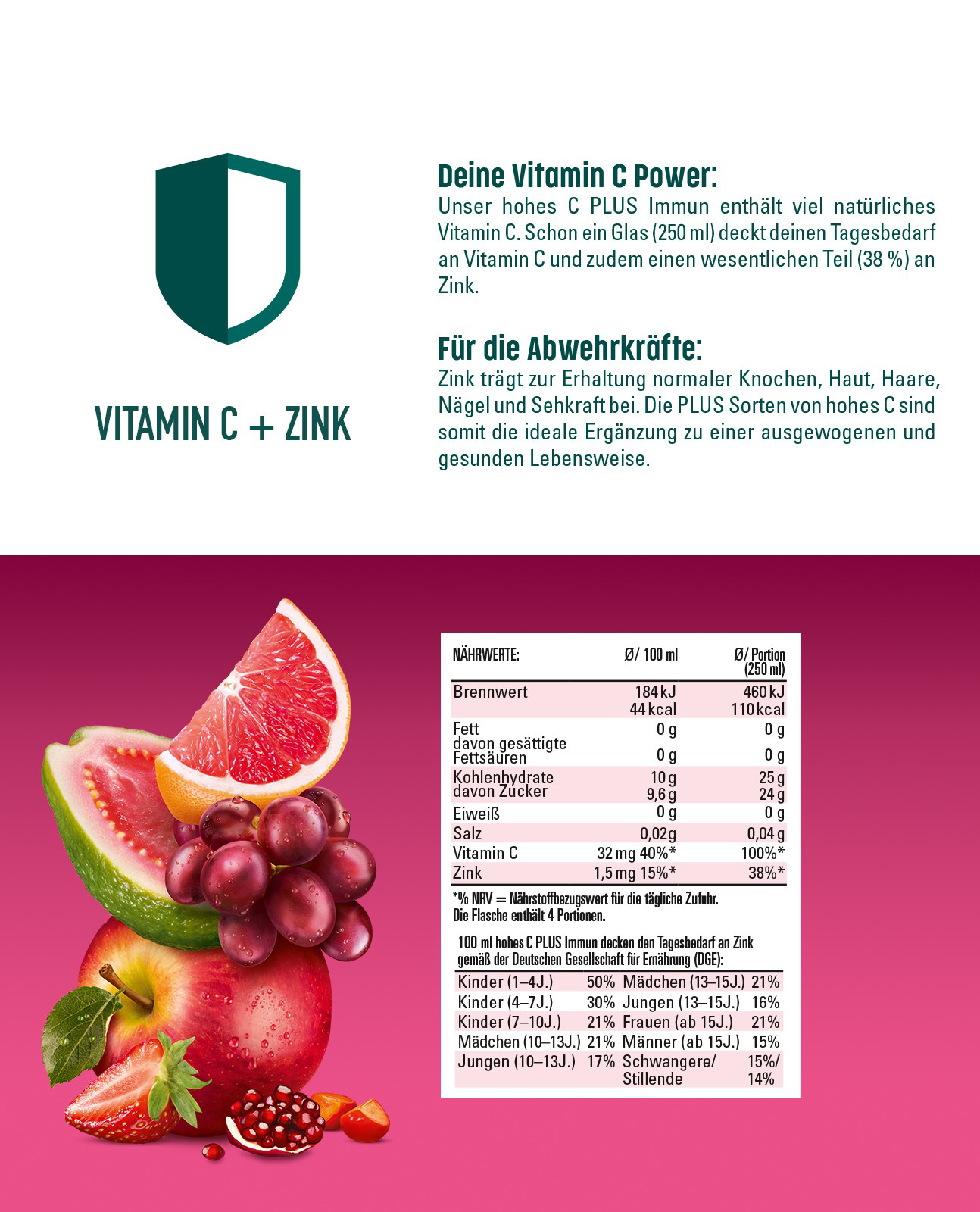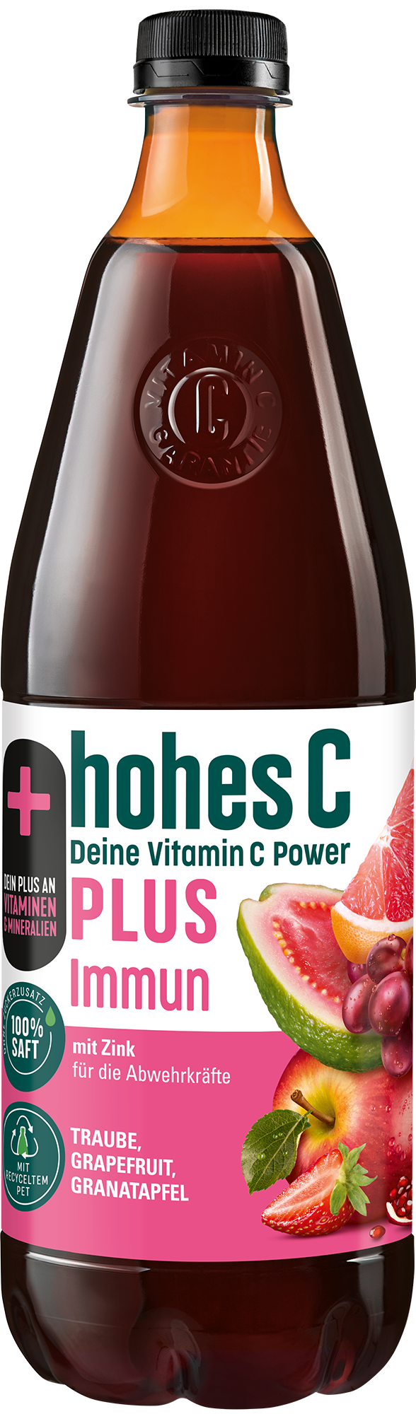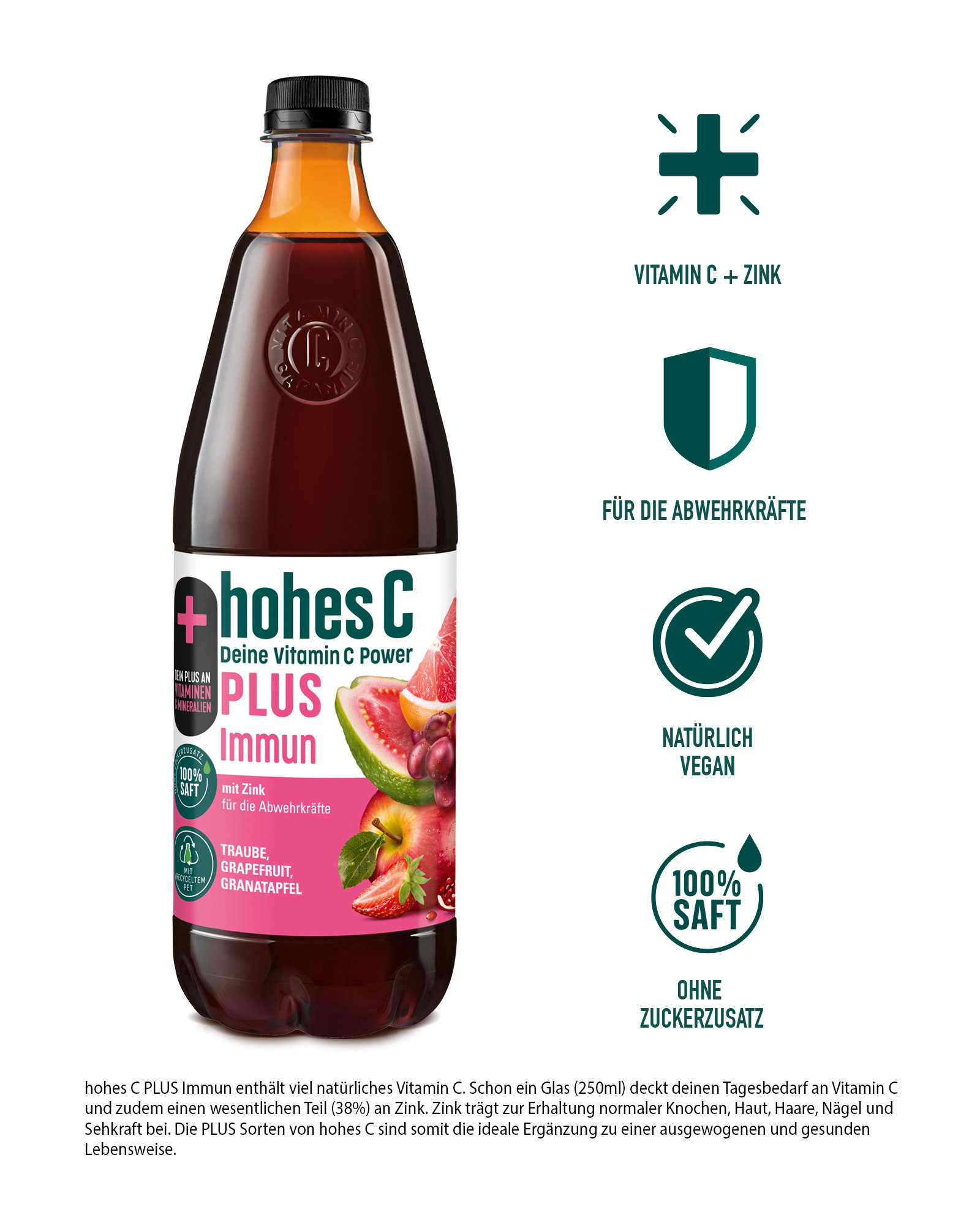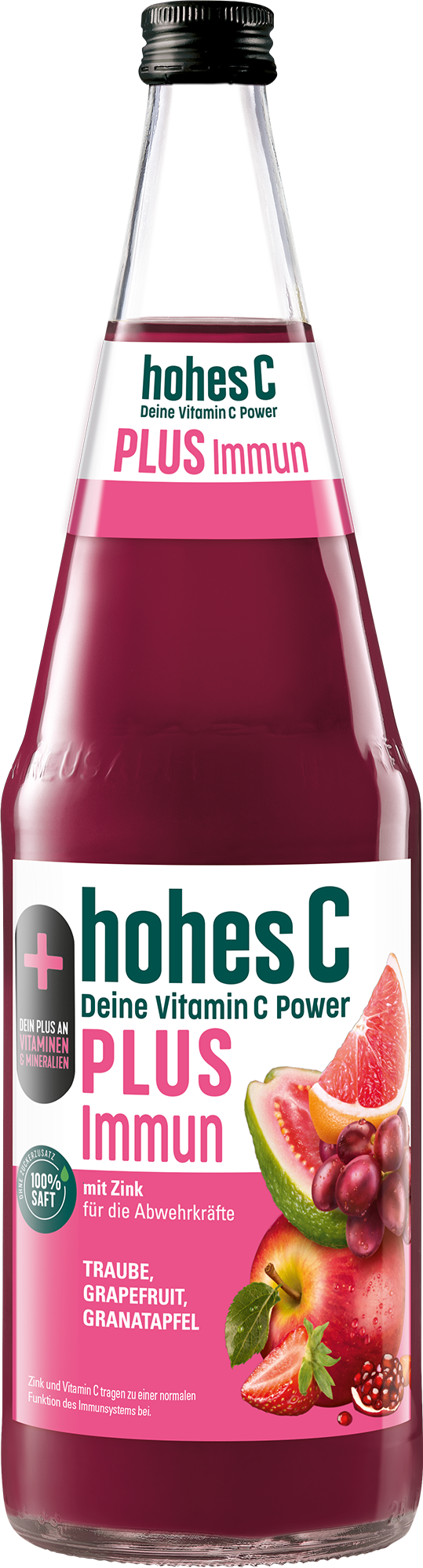 Dein PLUS an Vitaminen: hohes C PLUS Immun deckt bereits mit einem Glas (0,25L) deinen Tagesbedarf an natürlichem Vitamin C und einen wesentlichen Teil an Zink. Vitamin C trägt zu einer normalen Funktion des Immunsystems und zu einem normalen Energiestoffwechsel bei. Zink trägt zur Erhaltung normaler Knochen, Haare, Haut, Nägeln und Sehkraft bei. Eine ausgewogene Ernährung und gesunde Lebensweise werden empfohlen.