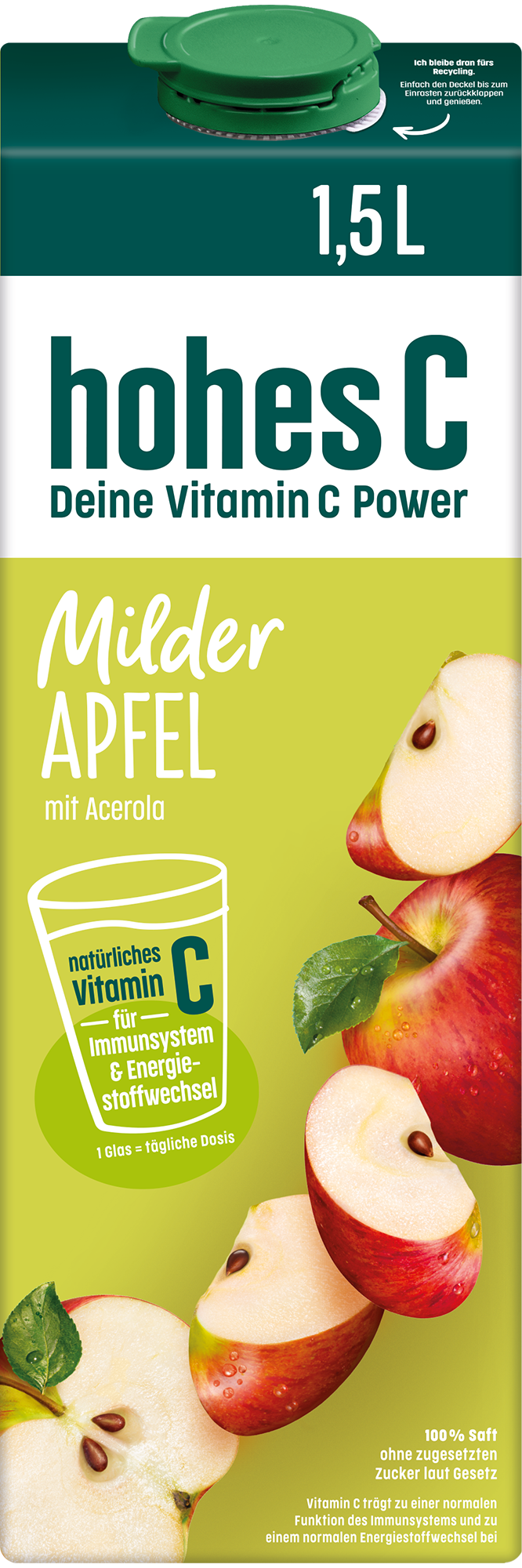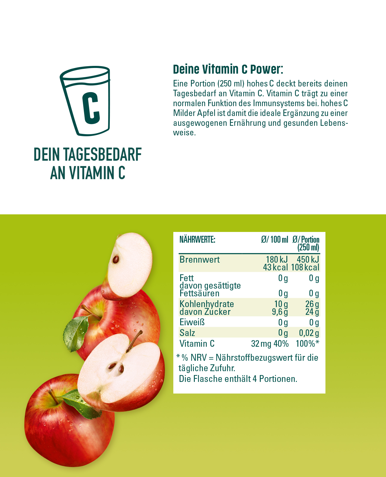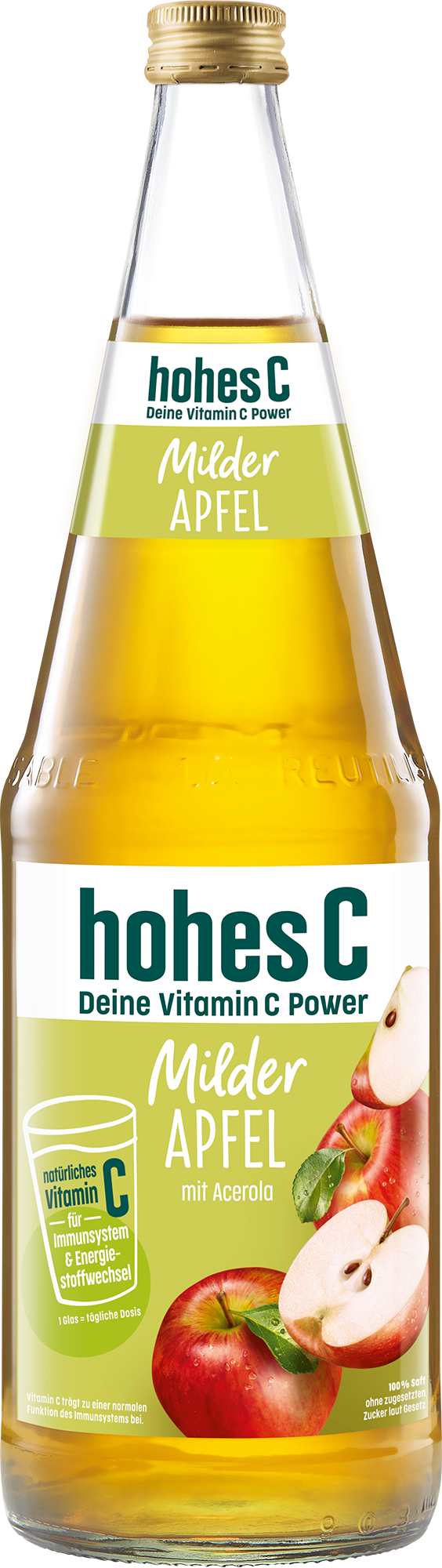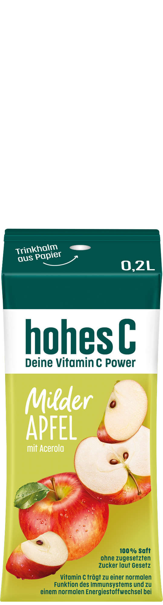 Schon gewusst? Bereits ein Glas hohes C Milder Apfel (0,25 L) deckt den Tagesbedarf an Vitamin C - und zwar mit natürlichem Vitamin C aus der Acerola. Vitamin C trägt zu einer normalen Funktion des Immunsystems und zu einem normalen Energiestoffwechsel bei. Eine ausgewogene Ernährung und gesunde Lebensweise werden empfohlen. Für unsere milden Säfte werden sorgfältig Früchte ausgewählt, die von Natur aus säureärmer sind.