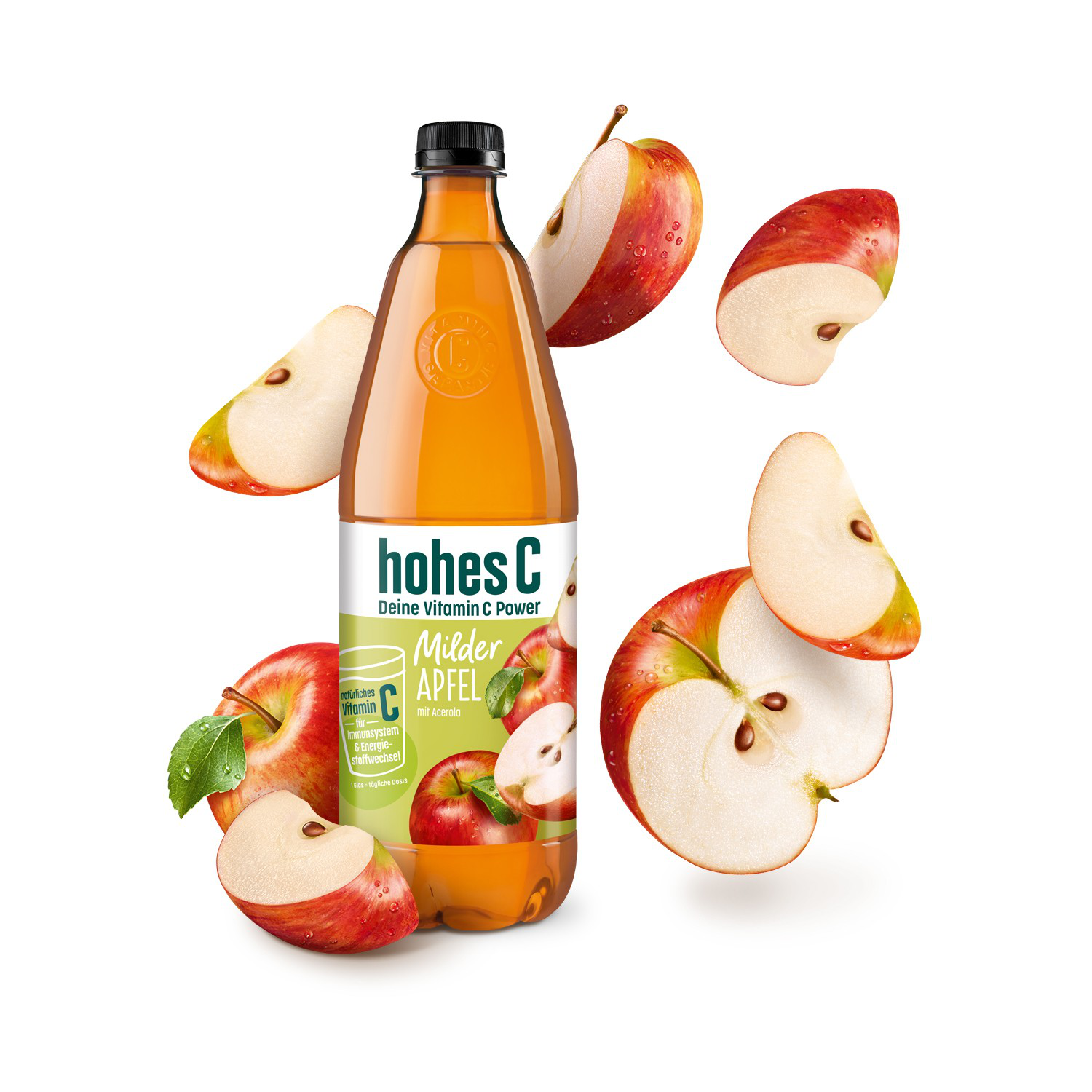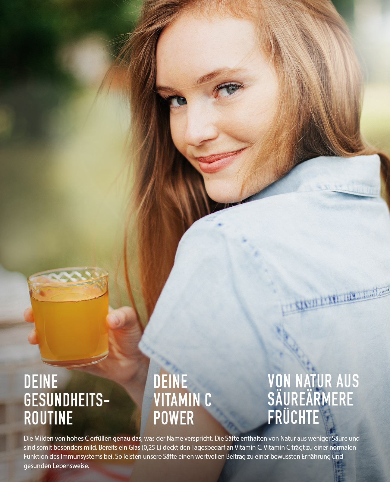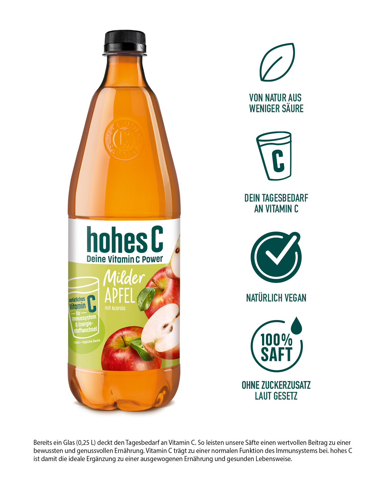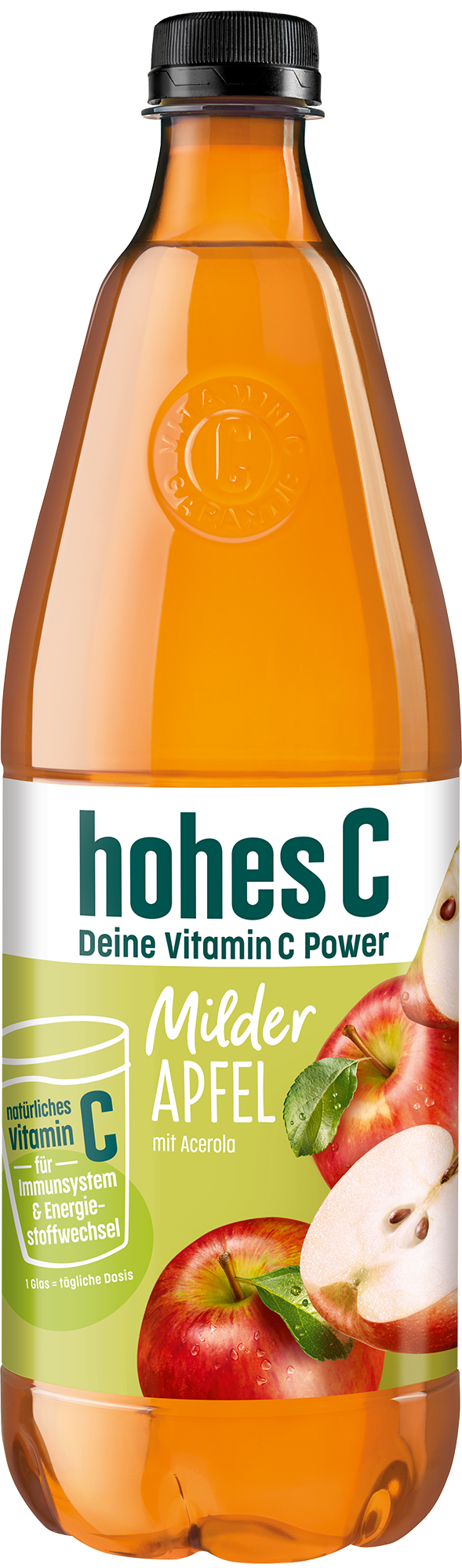 Schon gewusst? Bereits ein Glas hohes C Milder Apfel (0,25 L) deckt den Tagesbedarf an Vitamin C - und zwar mit natürlichem Vitamin C aus der Acerola. Vitamin C trägt zu einer normalen Funktion des Immunsystems und zu einem normalen Energiestoffwechsel bei. Eine ausgewogene Ernährung und gesunde Lebensweise werden empfohlen. Für unsere milden Säfte werden sorgfältig Früchte ausgewählt, die von Natur aus säureärmer sind.