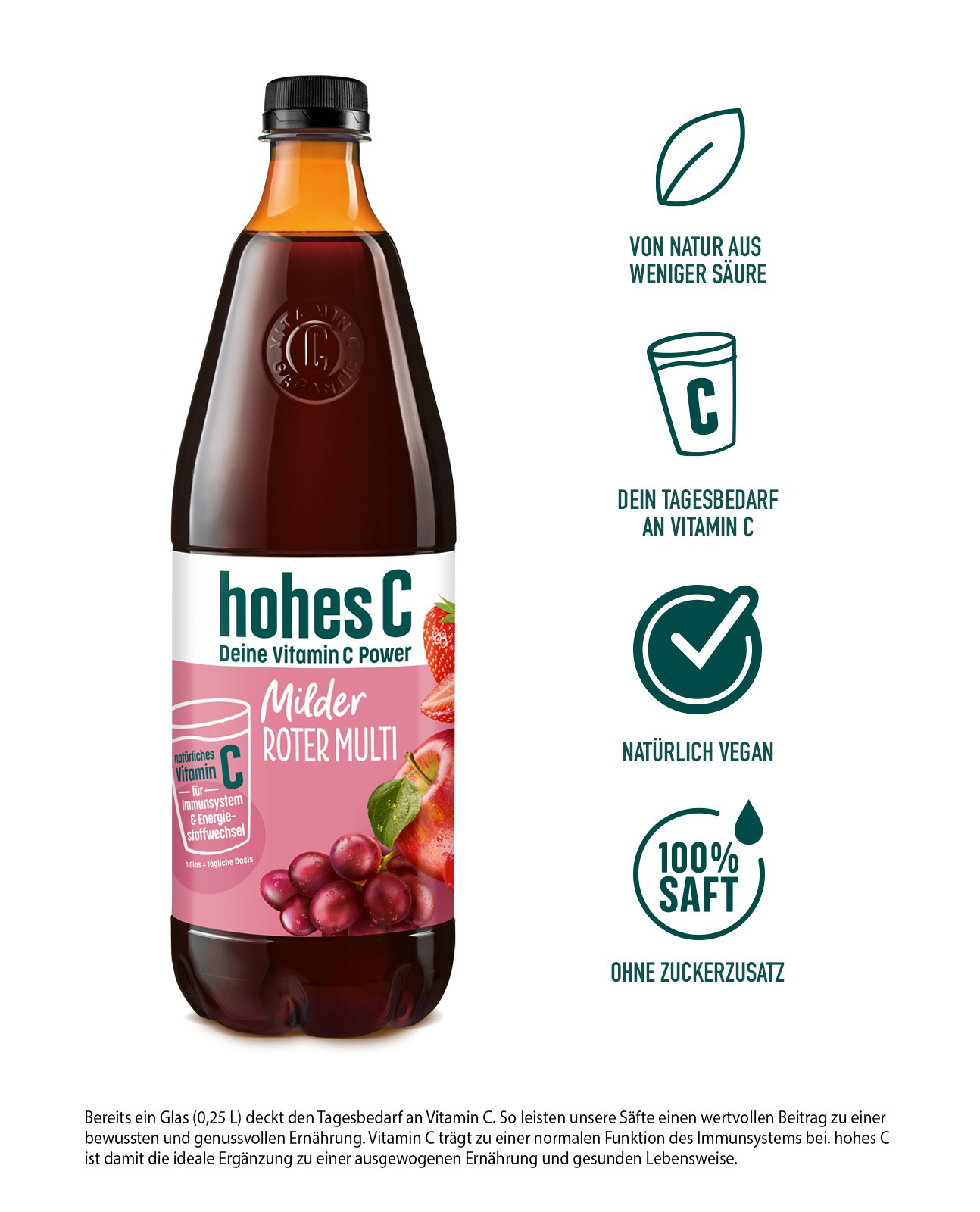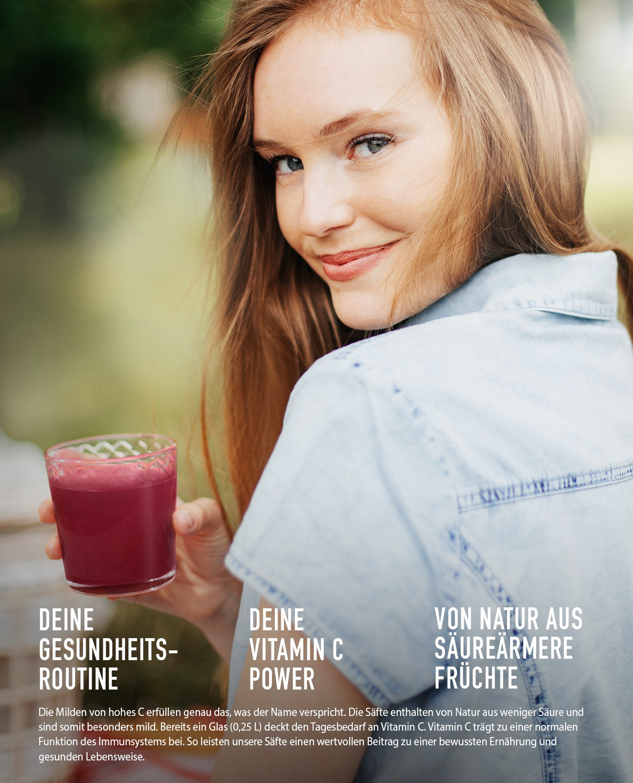 Schon gewusst? Bereits ein Glas hohes C Milder roter Multivitamin (0,25 L) deckt den Tagesbedarf an Vitamin C - und zwar mit natürlichem Vitamin C aus der Acerola. Vitamin C trägt zu einer normalen Funktion des Immunsystems und zu einem normalen Energiestoffwechsel bei. Eine ausgewogene Ernährung und gesunde Lebensweise werden empfohlen. Für unsere milden Säfte werden sorgfältig Früchte ausgewählt, die von Natur aus säureärmer sind.