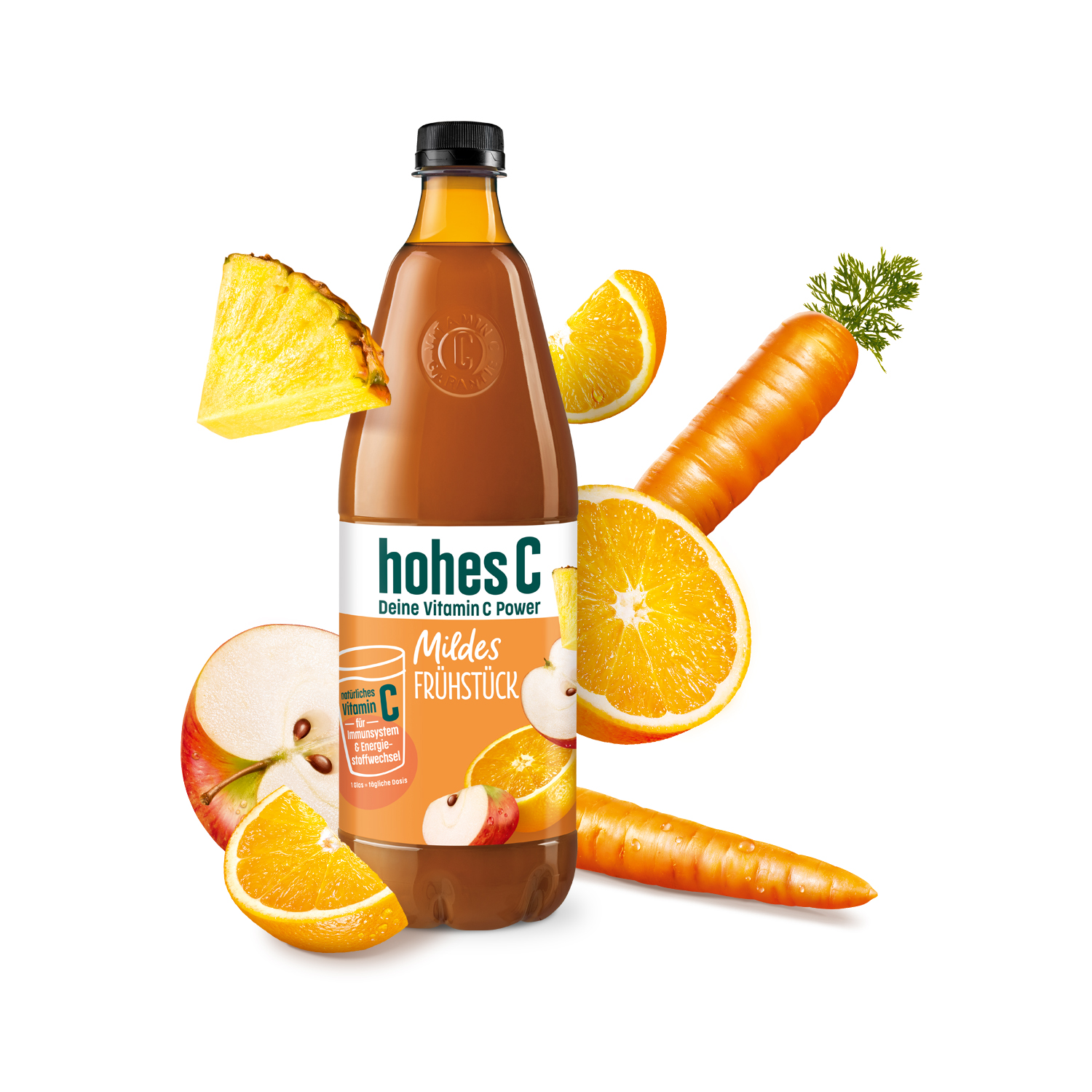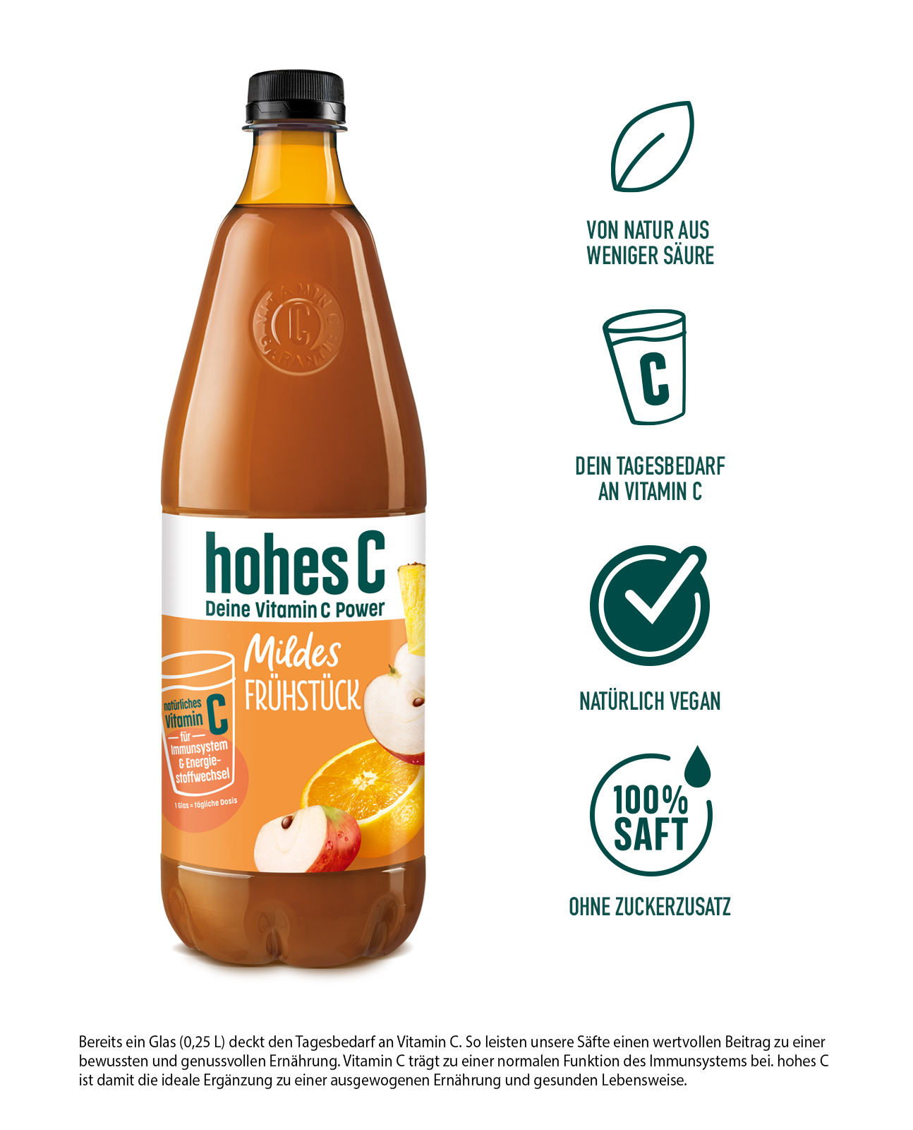 Schon gewusst? Bereits ein Glas hohes C Mildes Frühstück (0,25 L) deckt den Tagesbedarf an Vitamin C - und zwar mit natürlichem Vitamin C aus der Acerola. Vitamin C trägt zu einer normalen Funktion des Immunsystems und zu einem normalen Energiestoffwechsel bei. Eine ausgewogene Ernährung und gesunde Lebensweise werden empfohlen. Für unsere milden Säfte werden sorgfältig Früchte ausgewählt, die von Natur aus säureärmer sind.