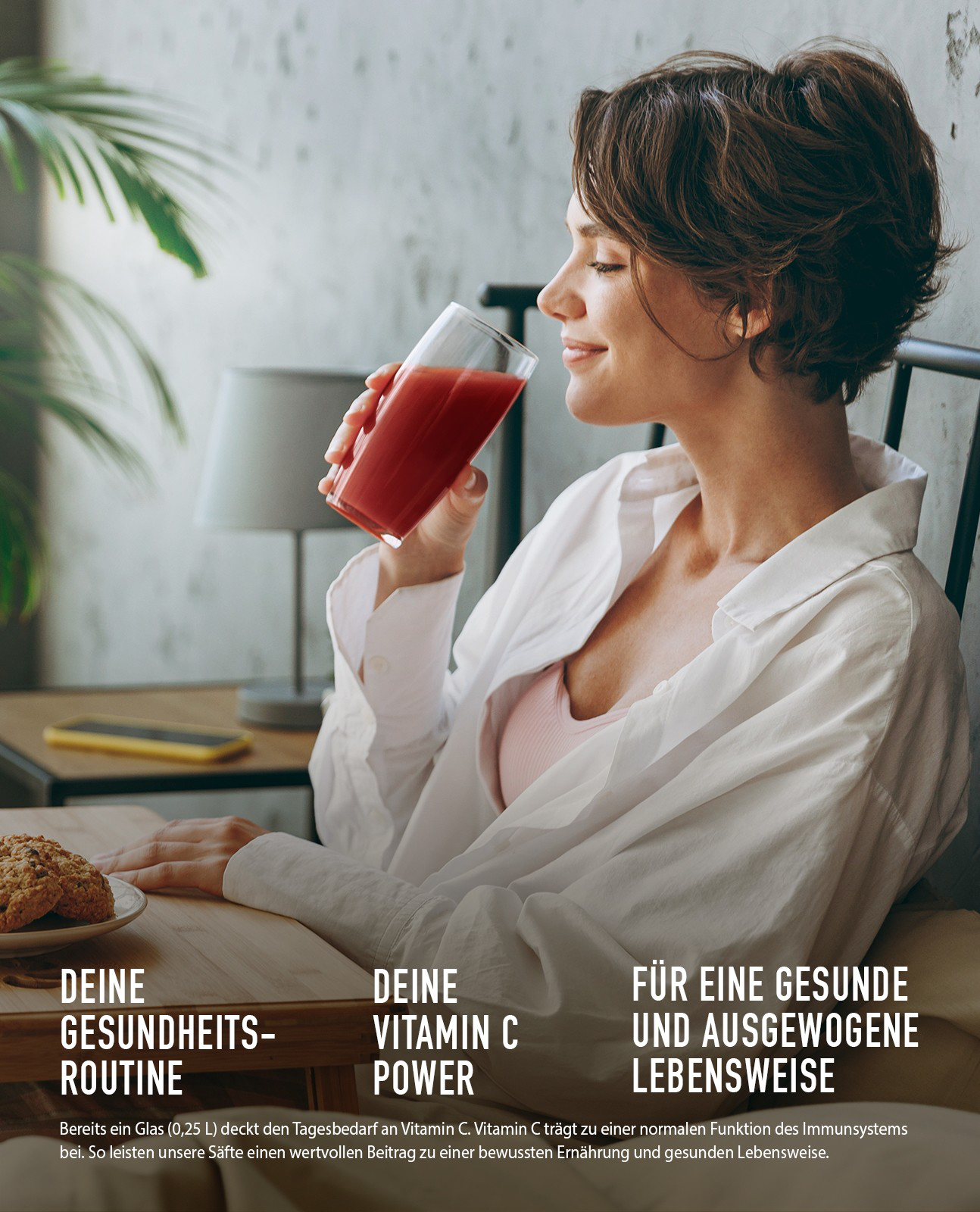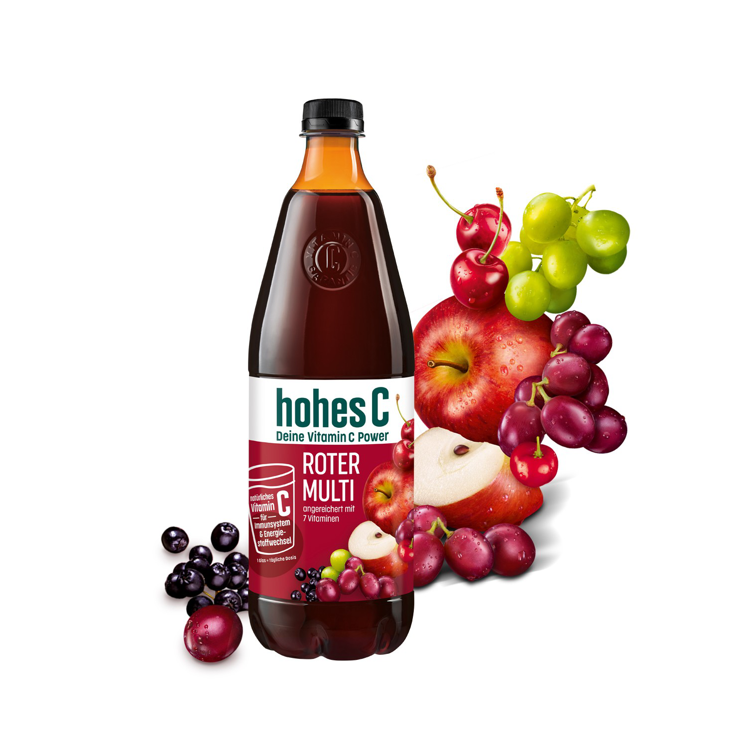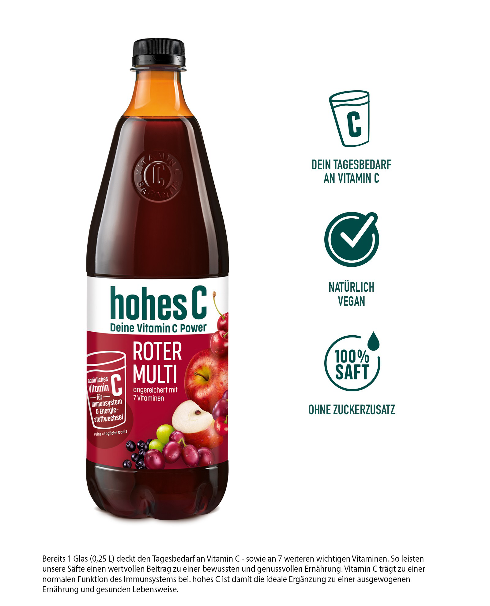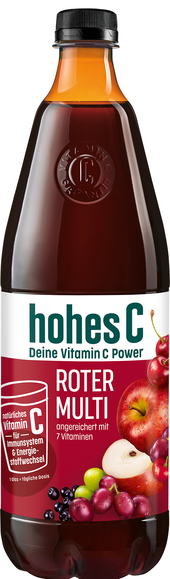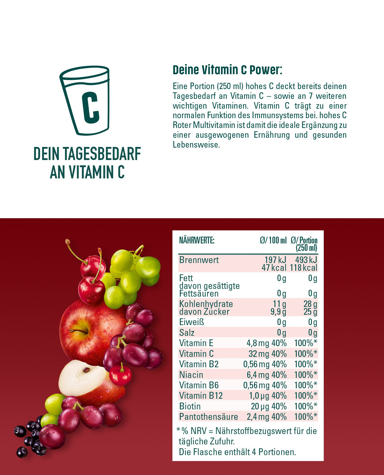 Schon gewusst? Bereits ein Glas hohes C Roter Multivitamin (0,25 L) deckt den Tagesbedarf an Vitamin C - und zwar mit natürlichem Vitamin C aus der Acerola. Vitamin C trägt zu einer normalen Funktion des Immunsystems und zu einem normalen Energiestoffwechsel bei. Eine ausgewogene Ernährung und gesunde Lebensweise werden empfohlen.