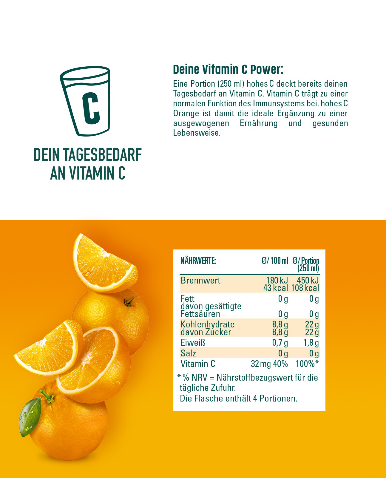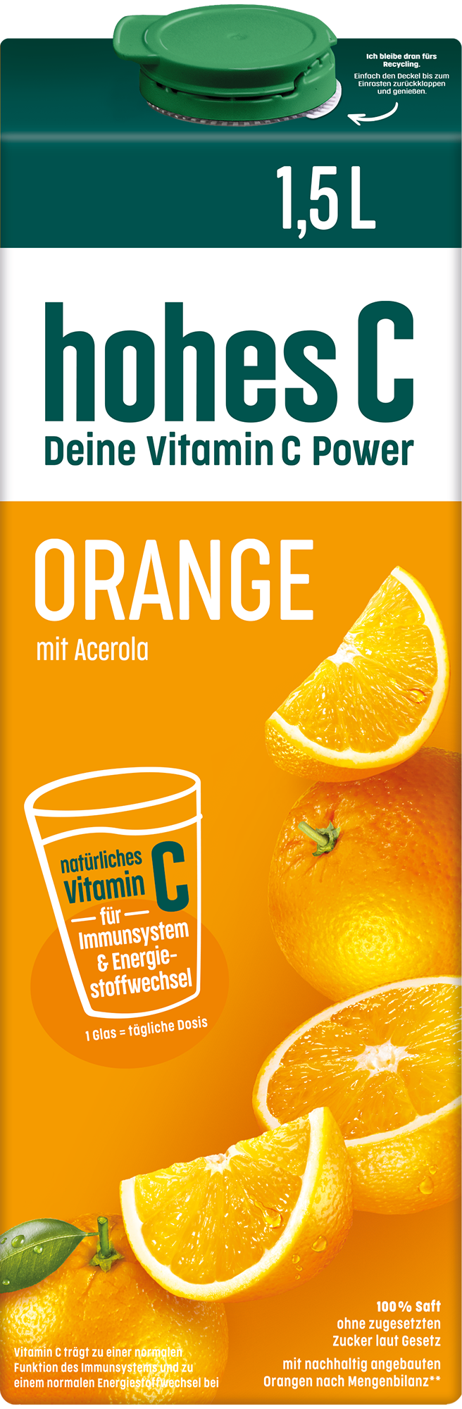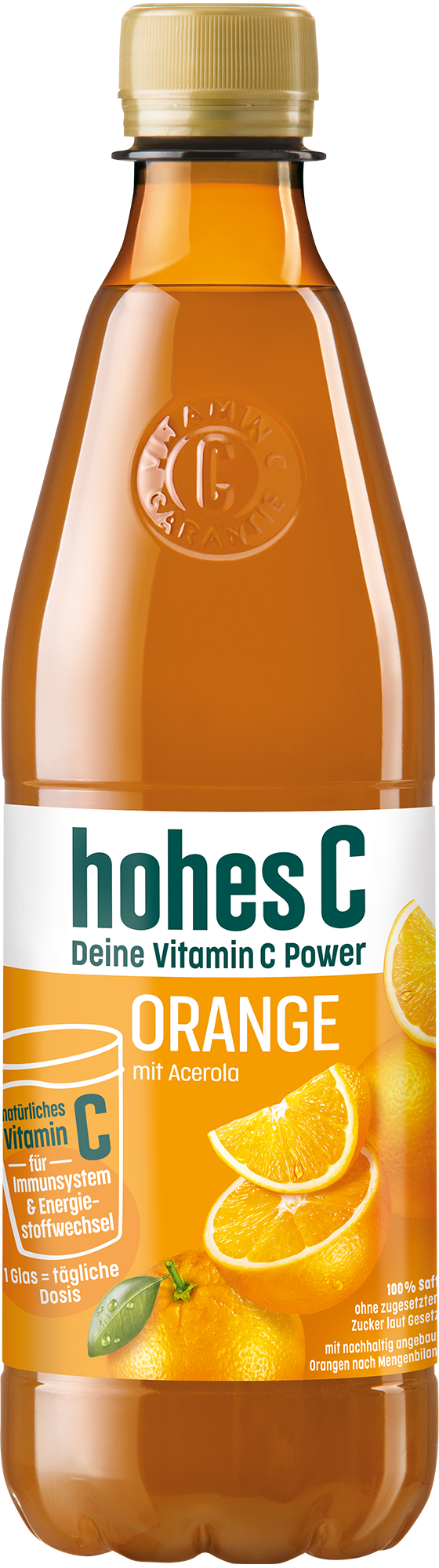 Schon gewusst? Bereits ein Glas hohes C Orange (0,25 L) deckt den Tagesbedarf an Vitamin C - und zwar mit natürlichem Vitamin C aus der Acerola. Vitamin C trägt zu einer normalen Funktion des Immunsystems und zu einem normalen Energiestoffwechsel bei. Eine ausgewogene Ernährung und gesunde Lebensweise werden empfohlen.