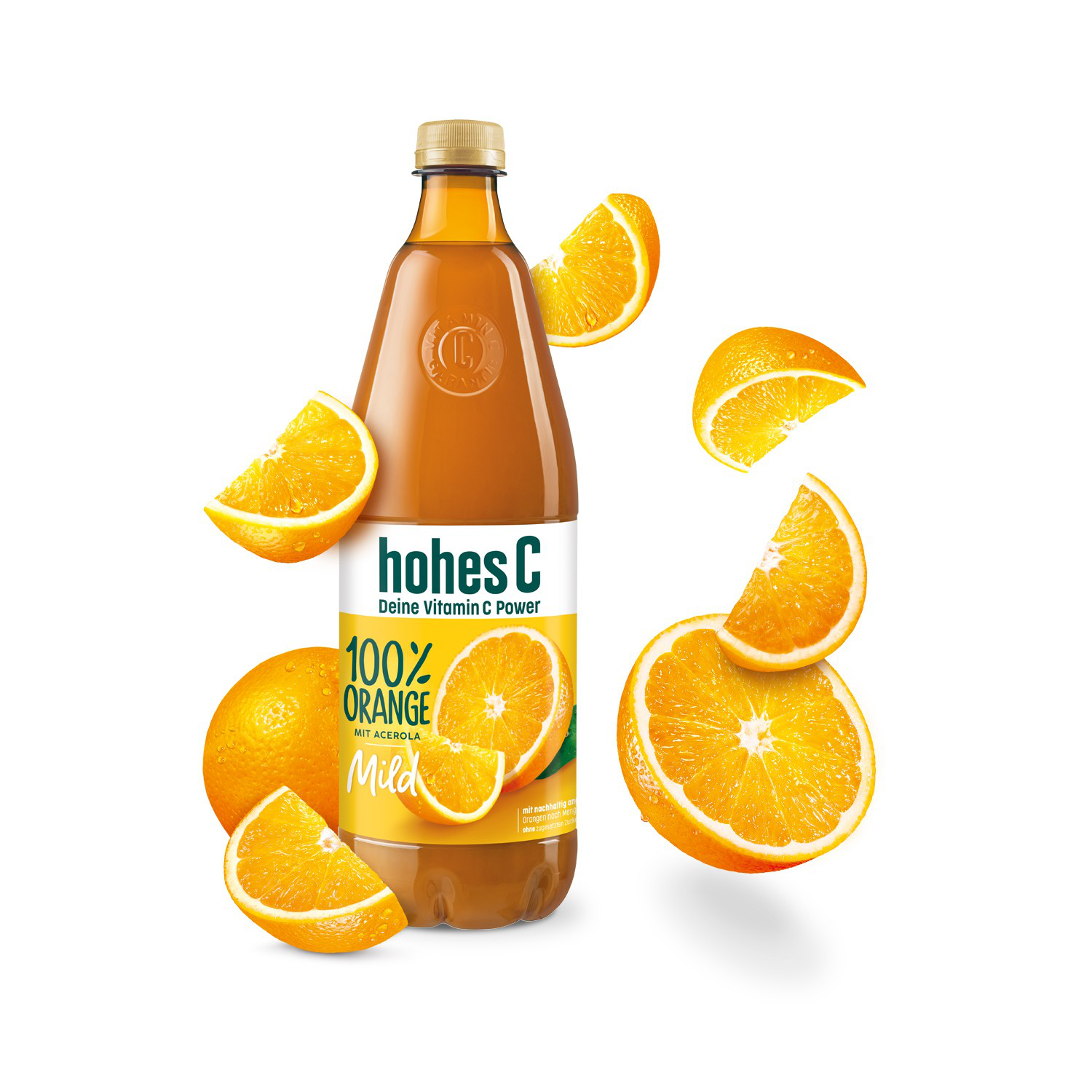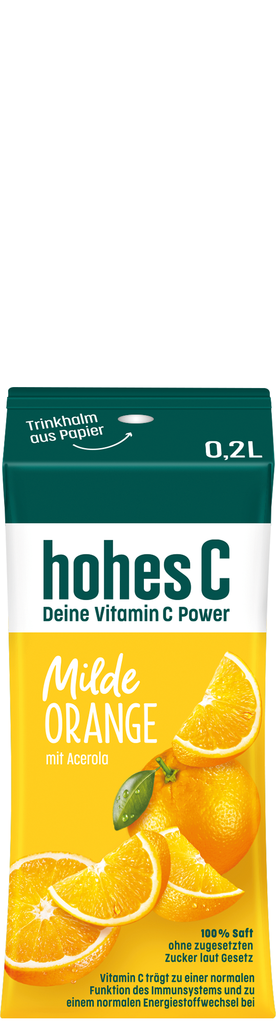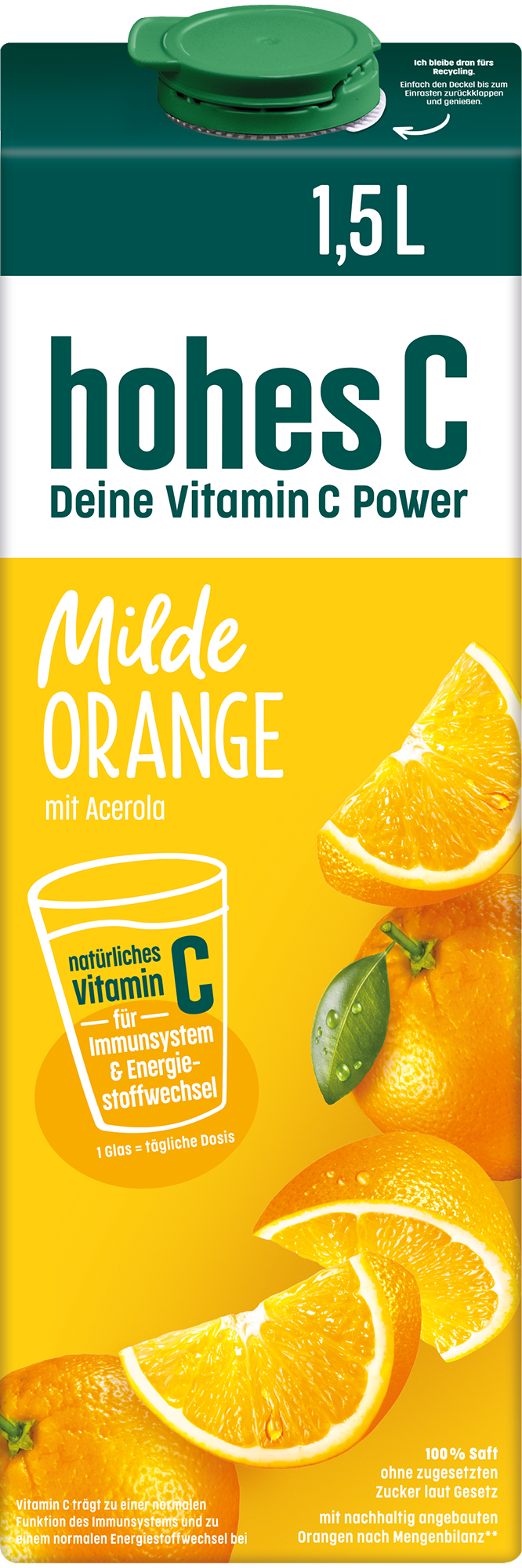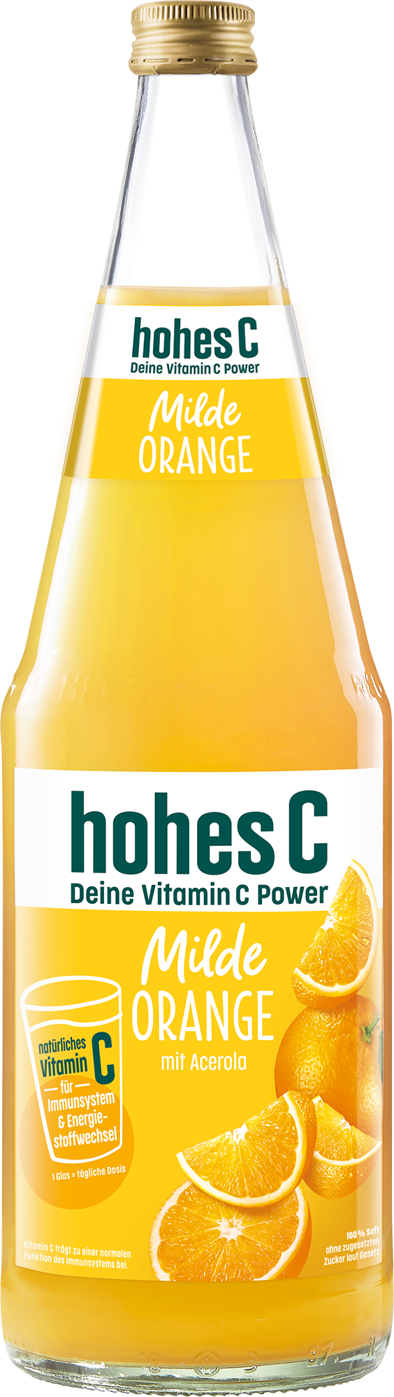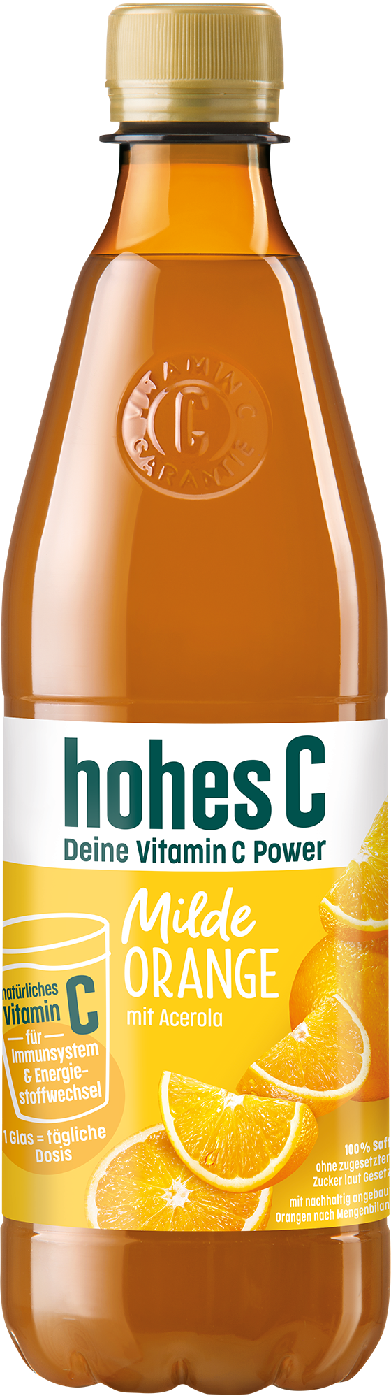 Schon gewusst? Bereits ein Glas hohes C Milde Orange (0,25 L) deckt den Tagesbedarf an Vitamin C - und zwar mit natürlichem Vitamin C aus der Acerola. Vitamin C trägt zu einer normalen Funktion des Immunsystems und zu einem normalen Energiestoffwechsel bei. Eine ausgewogene Ernährung und gesunde Lebensweise werden empfohlen. Für unsere milden Säfte werden sorgfältig Früchte ausgewählt, die von Natur aus säureärmer sind.