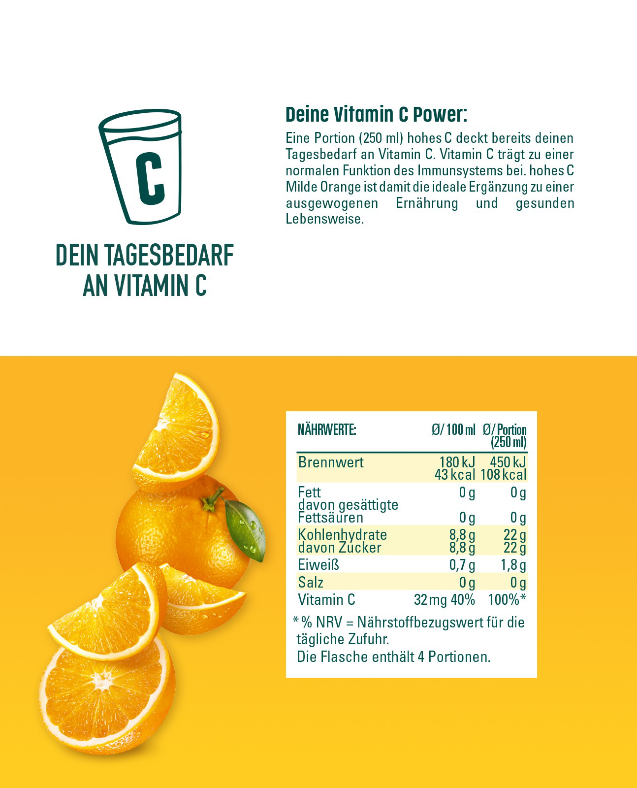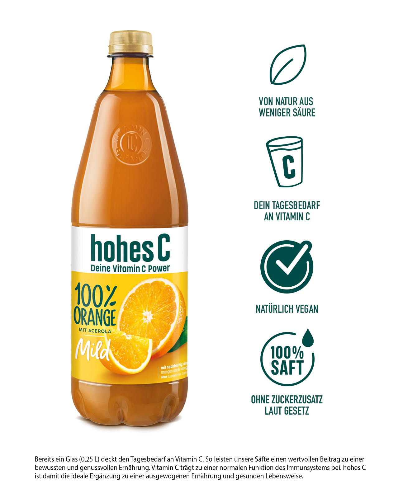 Schon gewusst? Bereits ein Glas hohes C Milde Orange (0,25 L) deckt den Tagesbedarf an Vitamin C. Vitamin C trägt zu einer normalen Funktion des Immunsystems und zu einem normalen Energiestoffwechsel bei. Eine ausgewogene Ernährung und gesunde Lebensweise werden empfohlen. Für unsere milden Säfte werden sorgfältig Früchte ausgewählt, die von Natur aus säureärmer sind.