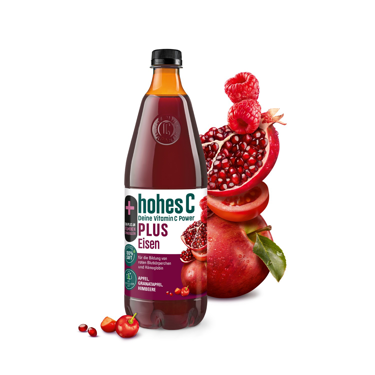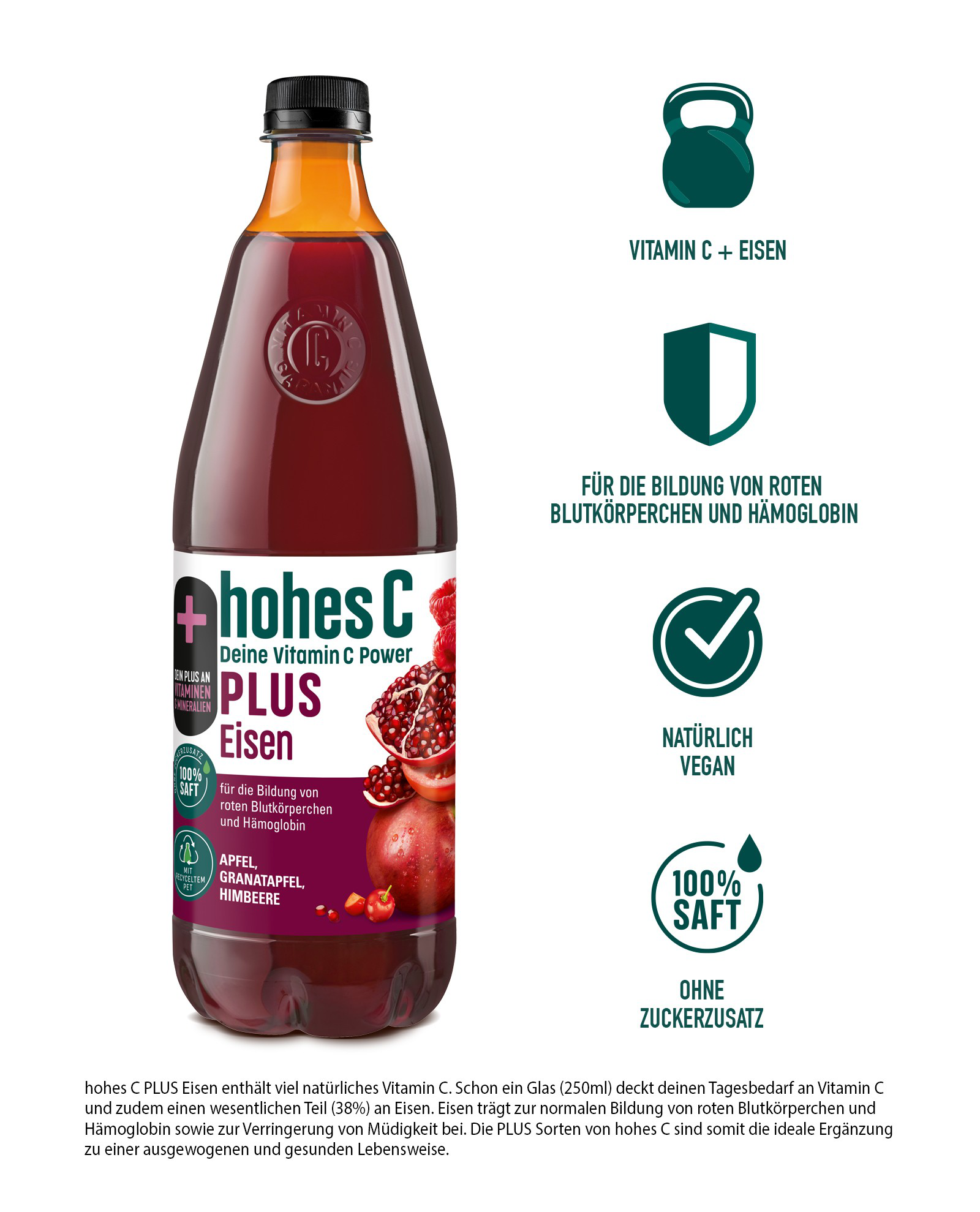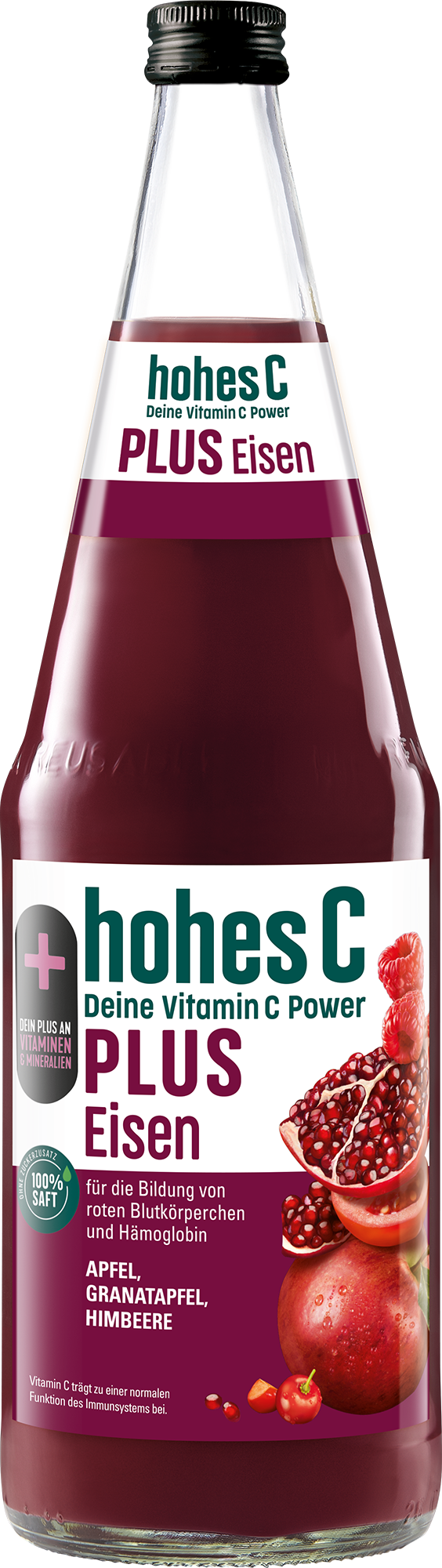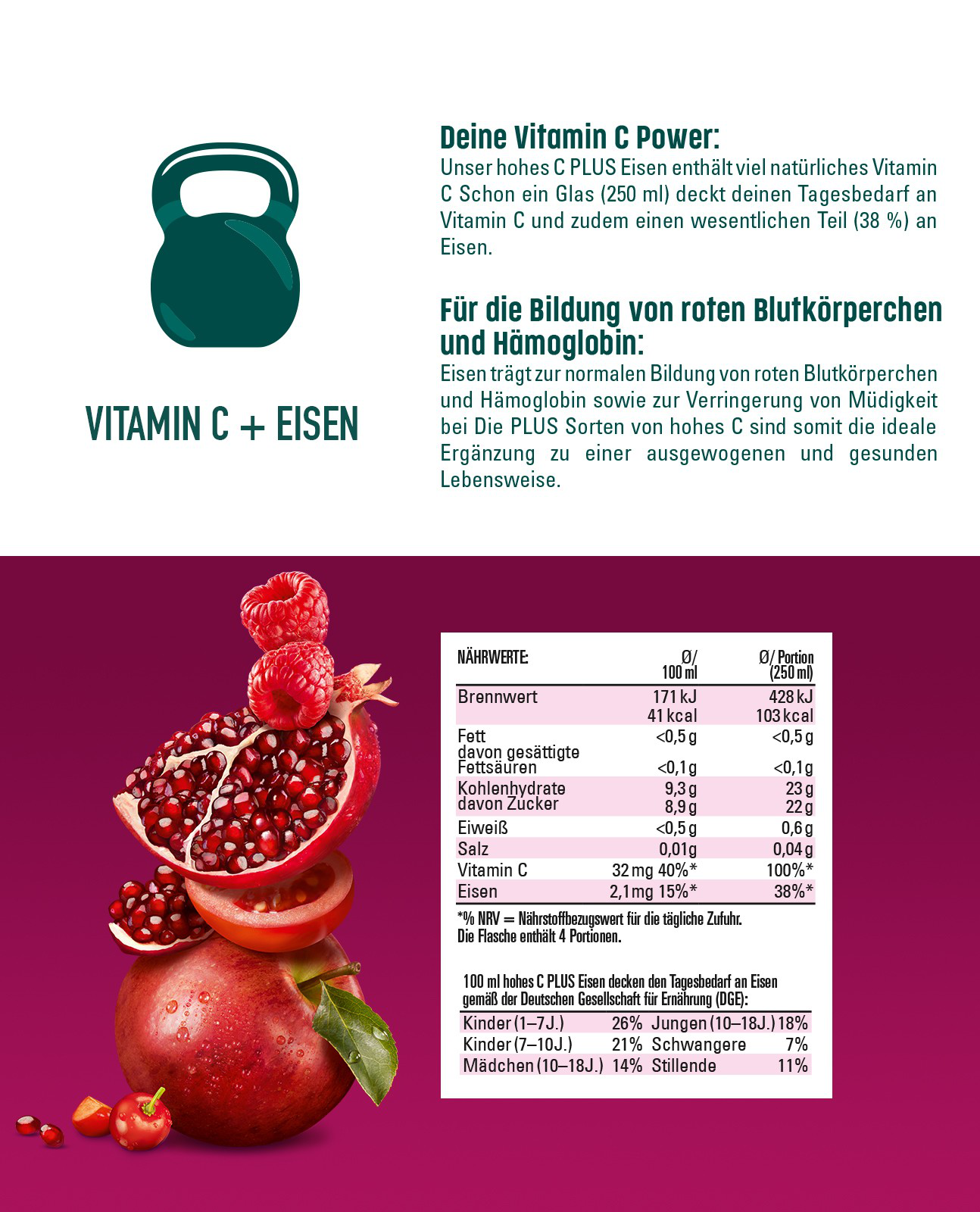 Dein PLUS an Vitaminen: hohes C PLUS Eisen deckt bereits mit einem Glas (0,25 L) deinen Tagesbedarf an natürlichem Vitamin C und einen wesentlichen Teil an Eisen. Vitamin C erhöht die Eisenaufnahme. Eisen trägt zur normalen Bildung von roten Blutkörperchen und Hämoglobin sowie zur Verringerung von Müdigkeit bei. Eine ausgewogene Ernährung und gesunde Lebensweise werden empfohlen.