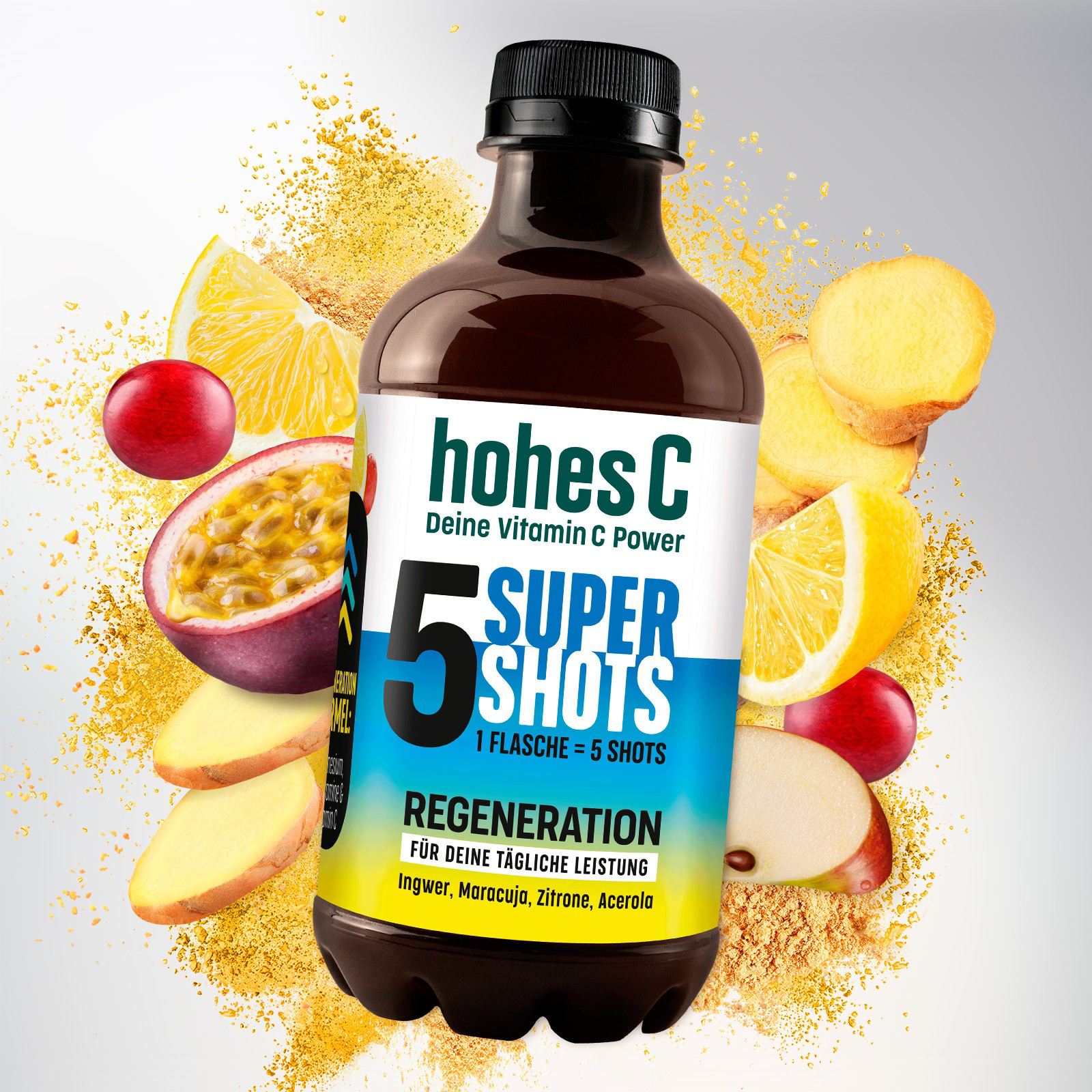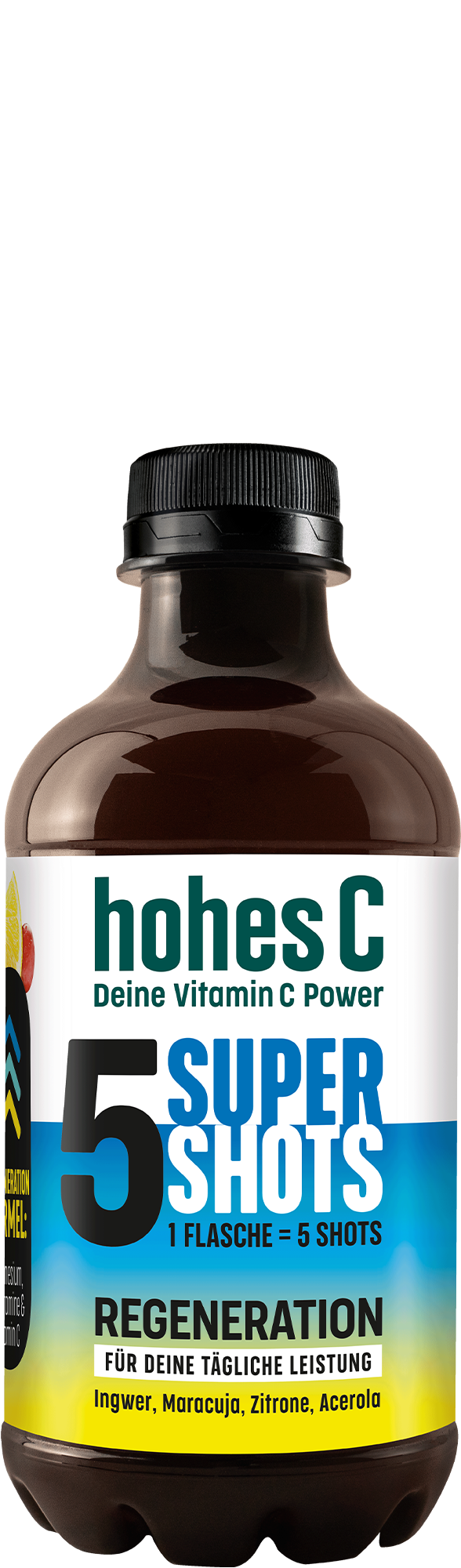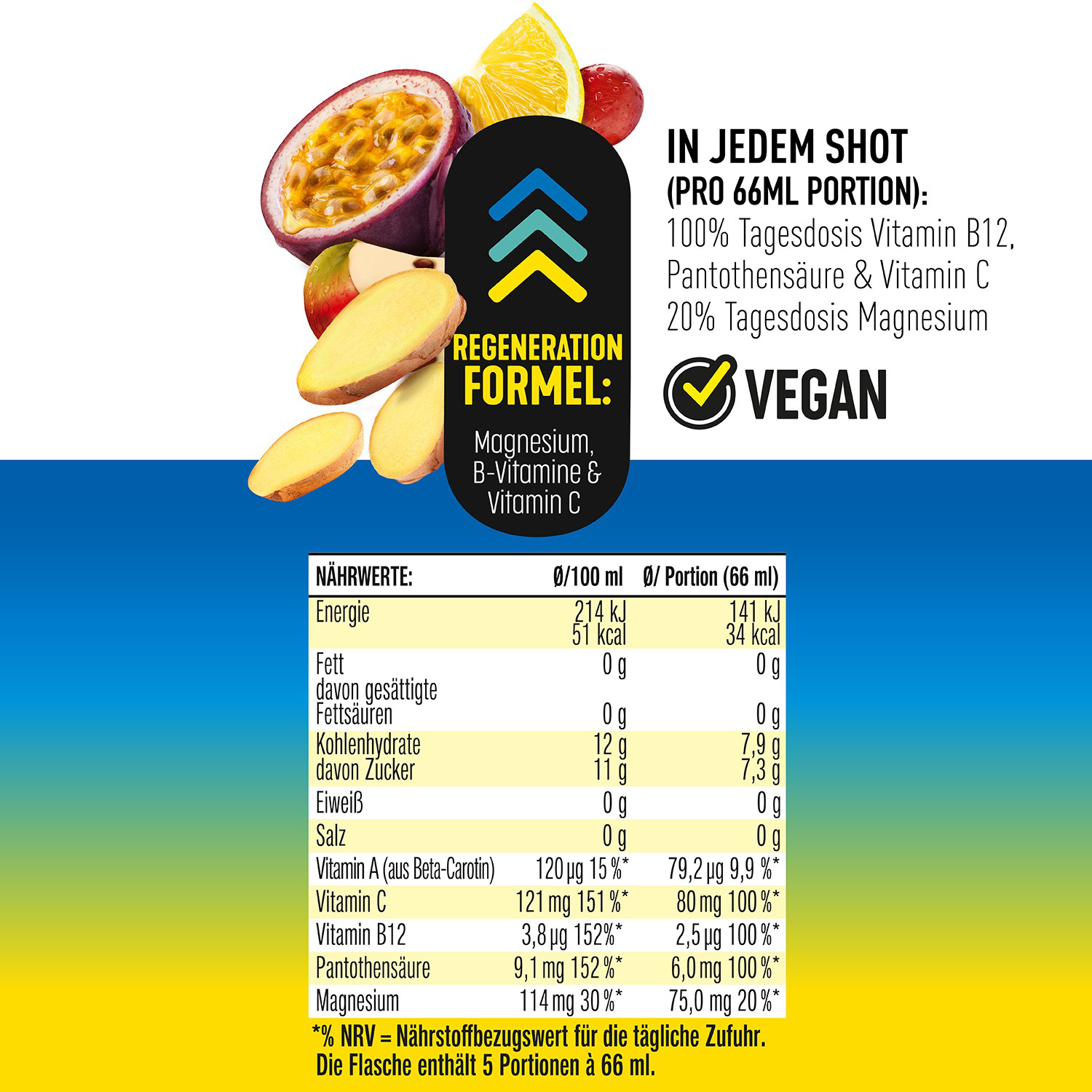 Leistungsstark durch den Alltag mit den hohes C Vitamin Shots Regeneration. Die leckere Kombination aus Ingwer, Maracuja, Zitrone und Acerola ist ideal für deine tägliche Leistung. Eine Tagesportion (66 ml) deckt bereits 20% deines Tagesbedarfs an Magnesium und sogar 100% an Vitamin B12, Pantothensäure und natürlichem Vitamin C. Magnesium trägt zu einer normalen Muskelfunktion bei. Magnesium, Vitamin B12 und Vitamin C tragen zu einer normalen psychischen Funktion bei. Eine ausgewogene Ernährung und gesunde Lebensweise werden empfohlen.