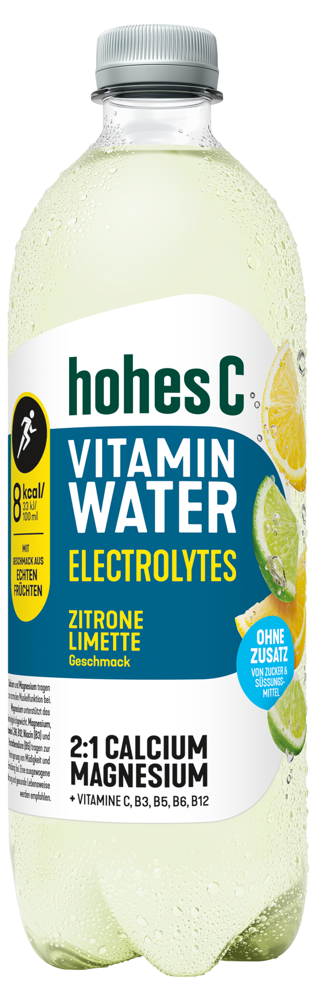 hohes C Vitamin Water Electrolytes mit Zitrone Limette Geschmack versorgt dich mit wichtigen Vitaminen und Elektrolyten. Calcium und Magnesium tragen zur normalen Muskelfunktion bei. Magnesium trägt zu einem normalen Elektrolytgleichgewicht bei. Magnesium, Vitamin C, B6, B12, Niacin (B3) und Pantothensäure (B5) tragen zur Verringerung von Müdigkeit und Ermüdung bei. Genieße die erfrischende Kombination aus Zitrone und Limette – ohne Zusatz von Zucker oder Süßungsmittel. Vegan und mit nur 8 kcal/ 100ml ideal für deinen aktiven Lebensstil. Eine ausgewogene Ernährung und gesunde Lebensweise werden empfohlen.