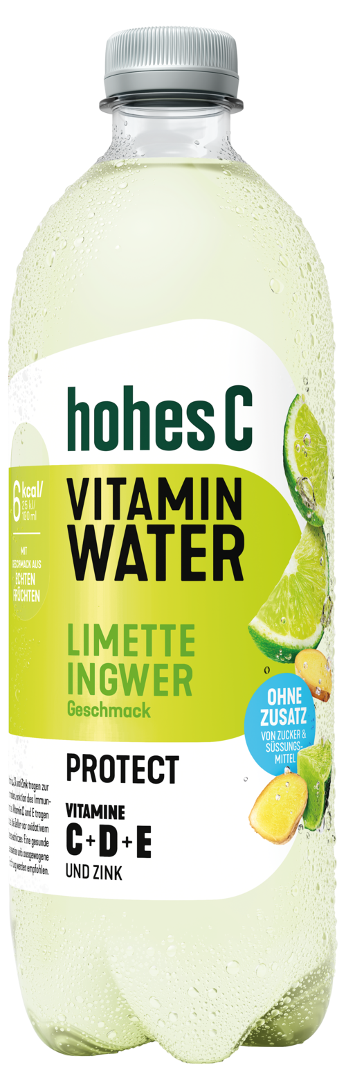 hohes C Vitamin Water Protect versorgt dich mit wichtigen Nährstoffen für dein Immunsystem. Vitamin C, D und Zink tragen zur normalen Funktion des Immunsystems bei, während Vitamin E hilft, die Zellen vor oxidativem Stress zu schützen. Genieße die erfrischende Kombination aus Limette und Ingwer – ohne Zusatz von Zucker oder Süßungsmittel. Vegan und mit nur 6 kcal/ 100ml ideal für deinen aktiven Lebensstil. Eine ausgewogene Ernährung und gesunde Lebensweise werden empfohlen.