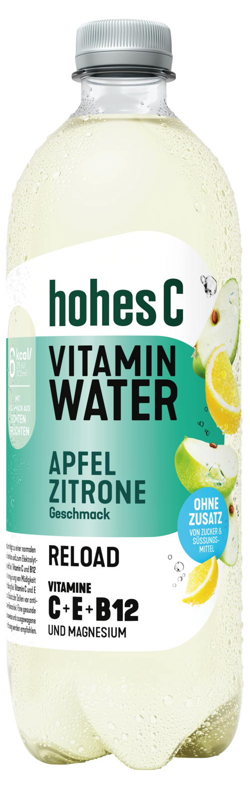 hohes C Vitamin Water Reload versorgt dich mit wichtigen Nährstoffen für Energie und Muskelfunktion. Magnesium trägt zu einer normalen Muskelfunktion und einem normalen Energiestoffwechsel bei. Vitamin C und B12 helfen, Müdigkeit und Ermüdung zu verringern, während Vitamin E die Zellen vor oxidativem Stress schützt. Pantothensäure unterstützt zudem die mentale Leistungsfähigkeit. Genieße die erfrischende Kombination aus Apfel und Zitrone – ohne Zusatz von Zucker oder Süßungsmittel. Vegan und mit nur 6 kcal/ 100ml ideal für deinen aktiven Lebensstil. Eine ausgewogene Ernährung und gesunde Lebensweise werden empfohlen.